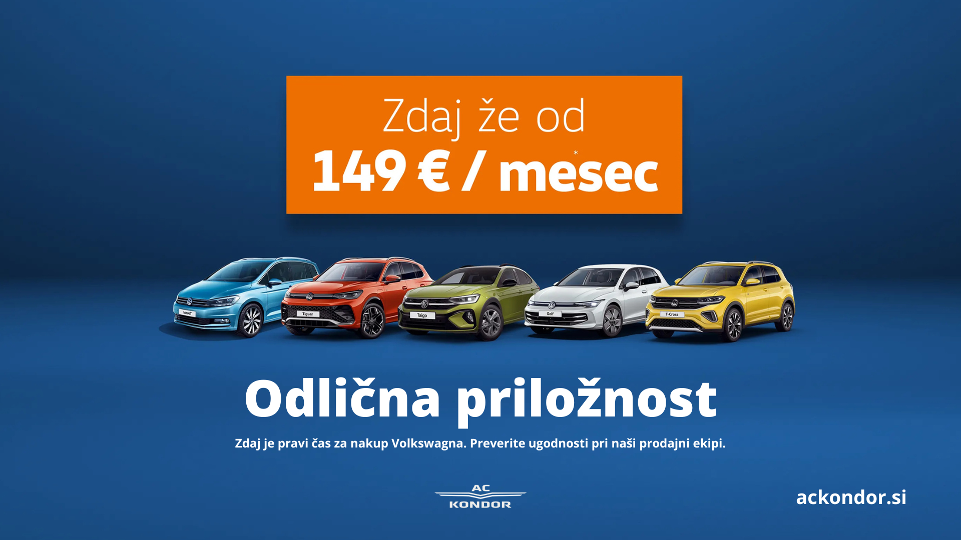 AC Kondor je pooblaščeni trgovec novih osebnih in gospodarskih vozil Volkswagen. Pred nakupom vam svetujemo in omogočamo, da testna vožnja odgovori na vprašanja. V prodajni ponudbi najdete tudi rabljena vozila z jamstvom. Za vas lahko uredimo tudi uvoz vozila iz tujine po naročilu in odkup rabljenega vozila.