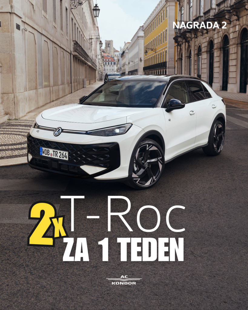- 2x žrebanje za nagrado “T-ROC ZA EN TEDEN“, kjer dobiš prav to: cel teden uživanja v vožnji z novim T-Rocom.